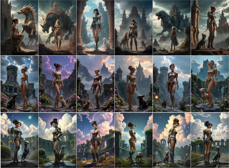 И вот теперь возьмёмся за самое интересное: лексически обогатим подсказку для модели T5, превратив её в пространное описание желаемой сцены. Смысл этого действа следующий: поскольку доступные для локального исполнения версии FLUX.1 дистиллированы, один и тот же текст на входе, но с разными значениями затравок (seed) будет порождать примерно одни и те же композиции, причём довольно-таки скудные по изобразительным средствам. Иными словами, вариативность этой модели хуже, чем у SDXL и даже SD 1.5, — там можно было ожидать в ответ на самые простые подсказки просто-таки буйства интерпретаций, хотя в плане эстетики эти интерпретации далеко не всегда устраивали оператора. Для FLUX.1 ситуация обратная: эстетика картинки, что порождается лаконичной подсказкой, чаще всего вполне приемлема (если не пытаться совмещать нечто с точки зрения модели несовместимое, вроде мечей и безбородости), — зато вариативность чрезвычайно скудна.