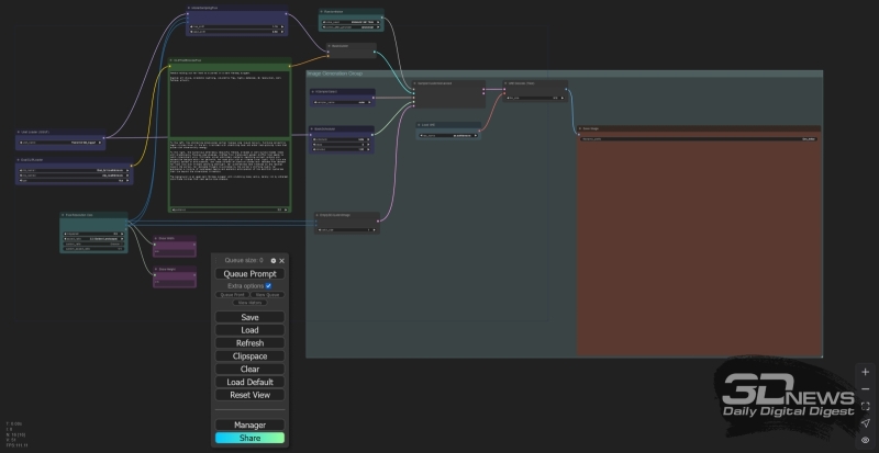 Вслед за этим после запуска рабочей среды — как раз при помощи того самого run_nvidia_gpu.bat — в нижней части главного меню веб-интерфейса ComfyUI появится кнопка «Manager». Вот как раз её посредством мы и будем устанавливать необходимые дополнения, а заодно и обновлять как их, так и рабочую среду в целом — это куда удобнее, чем вручную.