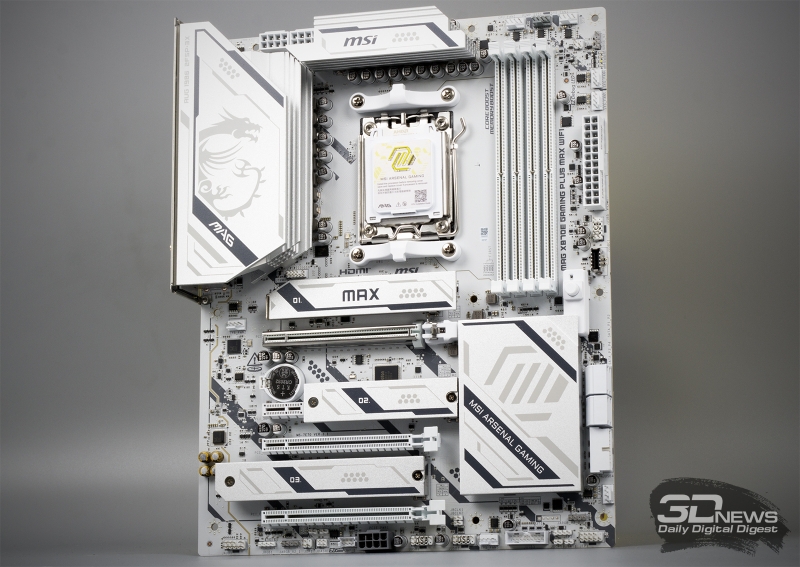 В обзорах материнских плат я редко описываю их внешний вид, но в случае с MAG X870E GAMING PLUS MAX WIFI определенно стоит сделать исключение. Дело в том, что устройство нельзя назвать белым. Скорее речь идет об использовании текстолита и прочих деталей серебряного цвета. Как человек, постоянно собирающий системные блоки, отмечу, что герой обзора одинаково хорошо будет смотреться как в конфигурациях белого цвета, так и в системах, использующих черные комплектующие. Простора для творчества много.