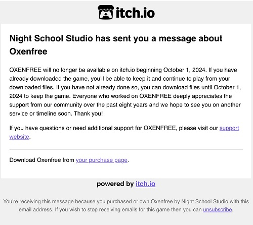 Как выяснилось, 1 октября Oxenfree станет недоступна на itch.io, и её владельцы больше не смогут скачать купленную игру. Чтобы продолжить пользоваться продуктом, необходимо загрузить его до упомянутой даты.