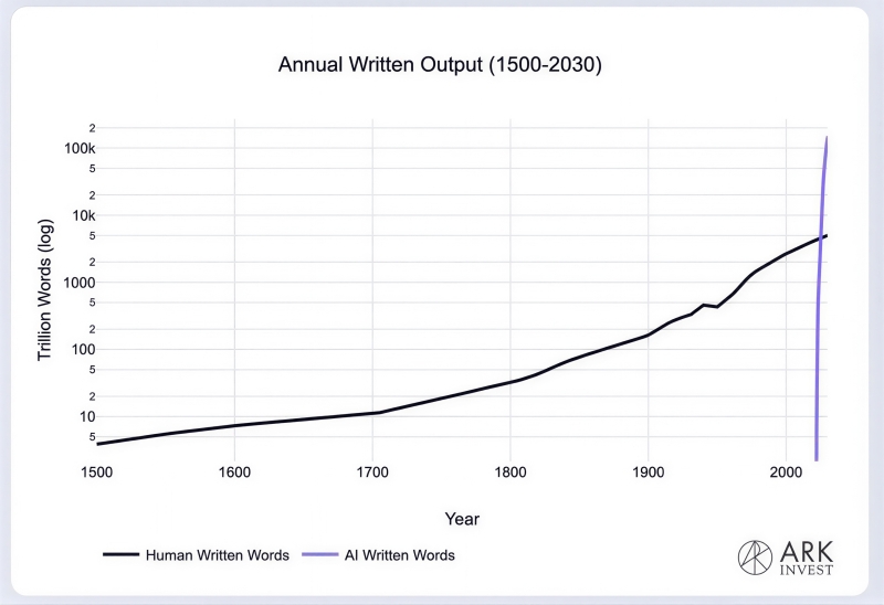 Опубликованный в конце марта исследователями из ARK Invest график по-настоящему впечатляет: искусственный интеллект выдаёт связный текст в ответ на операторские подсказки всего-то считаные годы, — но уже по итогам 2025-го суммарное количество слов в сформированных им высказываниях (200 триллионов) превысило всё, что написали за тот же самый год люди. К исходу же текущего десятилетия уже совокупный объём сгенерированных ИИ текстов (накопленным итогом) превзойдёт таковой для человечества за всю его историю — даже если вести отсчёт не с середины II тыс. н. э., как предлагают в ARK Invest, а принять в рассмотрение вообще все письменные произведения людей, включая не расшифрованные до сих пор надписи Хараппской цивилизации, строки критского линейного письма А или тэртерийские таблички. Конечно, эту активность генеративного ИИ нельзя считать прямым моделированием «задачи о бесконечных обезьянах»: выдача моделей вовсе не случайна — более того, обучаются они на всё тех же созданных людьми текстах. Но, может, однажды машина всё-таки сумеет создать произведение, достойное войти в золотой фонд человеческой культуры?