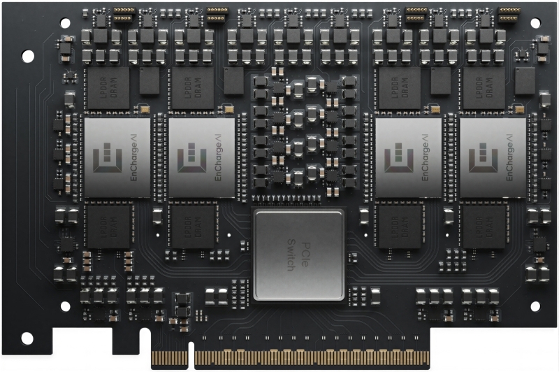 Ещё в середине 2025 г. основанный Навином Верма (Naveen Verma), профессором Принстонского университета, стартап EnCharge AI заявил о доведении до готовности к серийному производству аналогового ИИ-ускорителя EN100. Чип этот демонстрирует, по заявлению разработчика, двадцатикратное превосходство над классическими микросхемами, которые применяют (в составе графических ускорителей Nvidia или AMD) на ПК для локального исполнения моделей искусственного интеллекта. Однопроцессорная плата расширения типоразмера M.2, содержащая EN100 со всей необходимой обвязкой, обеспечивает, как утверждает разработчик, производительность в 200 трлн операций в секунду (Топс), рассеивая не более 8,25 Вт мощности, и предназначена для установки в персональные компьютеры, включая мобильные. Предусмотрена и четырёхпроцессорная плата с интерфейсом PCIe для рабочих станций и периферийных систем (edge cpmpiting) — она достигает порога в 1000 Топс.