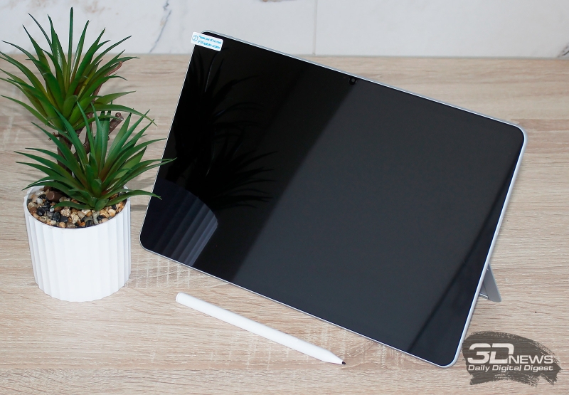 Корпус планшета выполнен из алюминиево-магниевого сплава, поэтому он одновременно и прочный, и лёгкий. Тактильно корпус также весьма приятен и совершенно не маркий. На задней панели корпуса есть регулируемая подставка, которая откидывается на 155 градусов.
