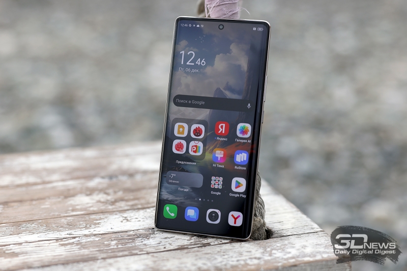 Экран здесь изогнут по краям — тот самый «водопад», который не так давно был признаком флагманов, но постепенно ушел в средний сегмент, топ-смартфоны предпочитают плоские панели. Но в ценовом сегменте CAMON 30S подобное решение все же редкость, его точно можно отнести к достоинствам устройства. Рамки вокруг огромного (6,78 дюйма) экрана очень тонкие, выраженного «подбородка» нет, фронтальная камера — в индивидуальном отверстии.