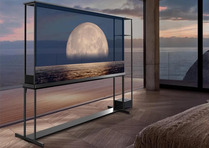 LG Signature OLED T позволяет переключаться между режимом прозрачности, в котором можно видеть всё, что находится позади OLED-панели, и непрозрачным режимом, позволяющим в полном комфорте смотреть программы на 77-дюймовом экране. Для последнего за прозрачной панелью Signature OLED T на штативе размещена специальная шторка, которая поднимается нажатием кнопки на ПДУ.