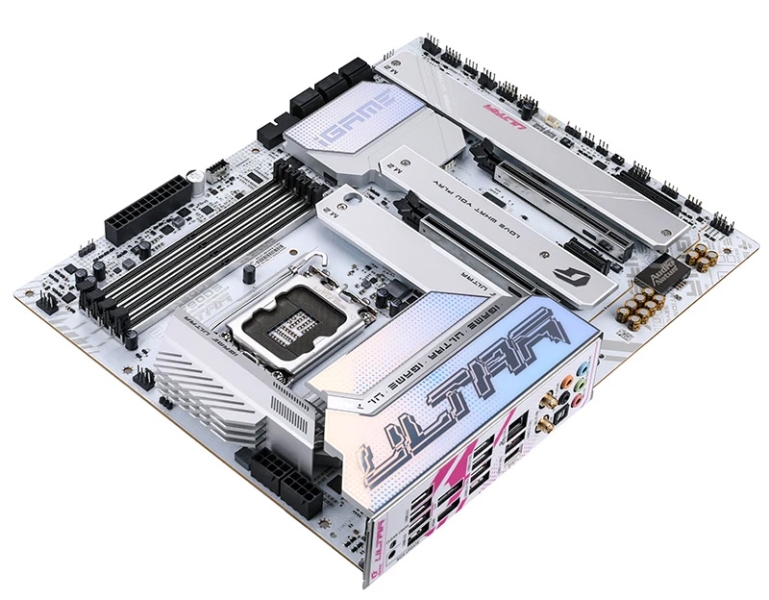 Дизайн Colorful iGame Z790D5 Ultra V20 очень необычный. С первого взгляда кажется, что плата белая, но на самом деле она переливается цветами под разными углами, благодаря голографическим наклейкам на радиаторе VRM и чипсете.