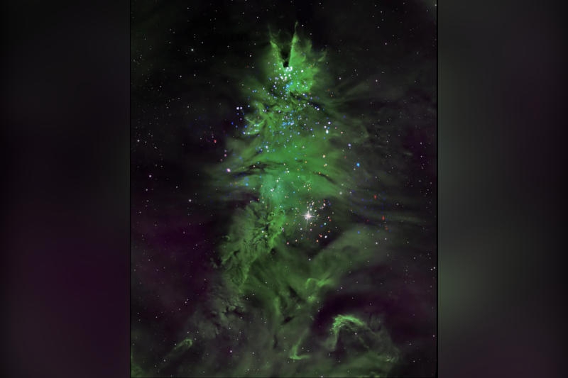 Ещё одно название NGC 2264 — скопление Снежинки. Его в 1784 году открыл Уильям Гершель (William Herschel). Скопление молодых звёзд возрастом от 1 млн до 5 млн лет находится примерно в 2500 световых лет от Земли и наблюдается в созвездии Единорога. На снимок попали синие и белые огни, окружённые завитками газа — своего рода «еловые иголки», а зелёный цвет — видимое в оптическом диапазоне облако пыли и газа.