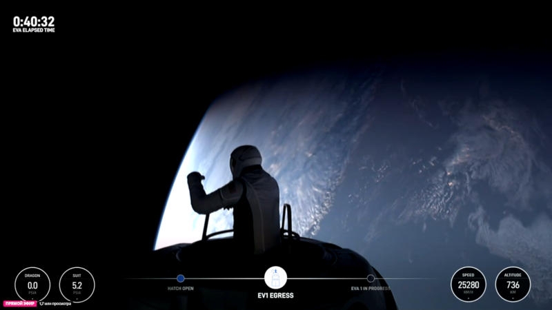 Люк был открыт на 38-й минуте, когда корабль пролетал на высоте 740 км над Индийским океаном, а ещё две минуты спустя Айзекман вышел в открытый космос, где он пребывал около десяти минут. Это был первый в истории выход в открытый космос космического туриста — прежде выходили только профессиональные космонавты.