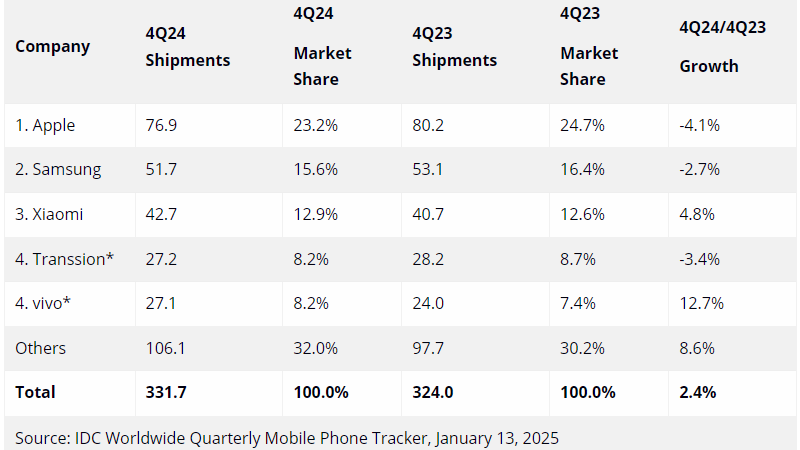Четвёртое место разделили между собой Transsion и Vivo, занимающие по 8,2 % рынка, причём если первая в прошлом квартале сократила поставки смартфонов на 3,4 %, то вторая их увеличила на 12,7 %. Все прочие поставщики смартфонов занимают сообща 32 % мирового рынка, за год этот показатель вырос с 30,2 % в четвёртом квартале 2023 года.