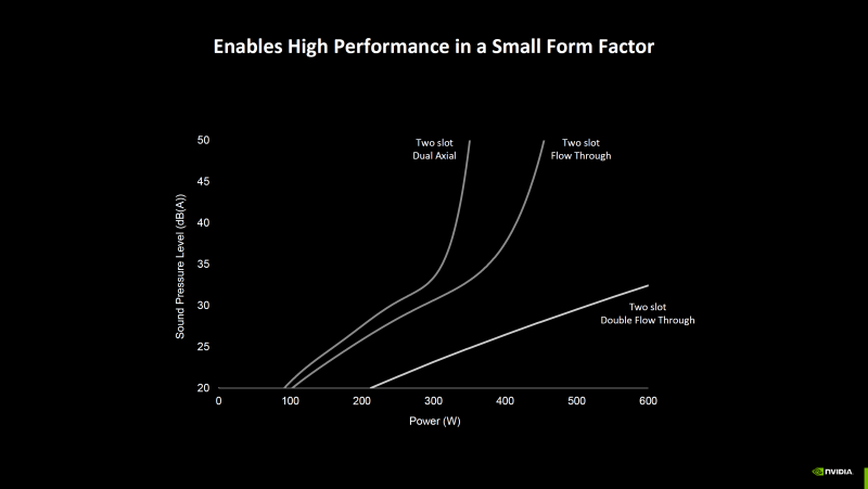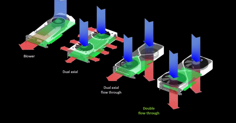 В эталонных видеокартах GeForce RTX 5000 FE компания Nvidia использовала новый дизайн системы охлаждения под названием Double Flow Through. Это нововведение позволяет обоим вентиляторам пропускать воздух через рёбра радиатора насквозь, в отличие от прежних конструкций систем охлаждения эталонных версий (GeForce RTX 30-й и 40-й серий), где поток воздуха от одного из вентиляторов блокировался печатной платой.