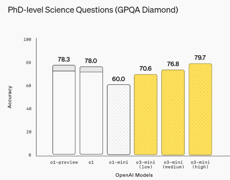 Первоначально анонсированная в рамках 12-дневного предрождественского марафона премьер OpenAI, модель o3-mini призвана сравниться с o1 по производительности в задачах, связанных с математикой, написанием программного кода и научными дисциплинами, при этом отвечая быстрее. OpenAI утверждает, что o3-mini работает на 24 % быстрее, чем o1-mini, и при этом даёт более точные ответы. Как и o1-mini, новая модель будет демонстрировать ход своих размышлений при решении задачи, а не просто предоставлять готовый ответ.