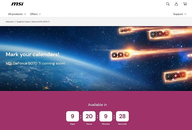Компания Nvidia готовится к запуску новой видеокарты GeForce RTX 5070 Ti, дата выхода которой была официально подтверждена партнёром производителя компанией MSI. На сайте MSI французского подразделения появилась специальная страница с обратным отсчётом времени до релиза GeForce RTX 5070 Ti, который состоится 20 февраля. Ранее эта дата уже упоминалась в эксклюзивных сообщениях и подтверждалась крупными ретейлерами США и Франции.