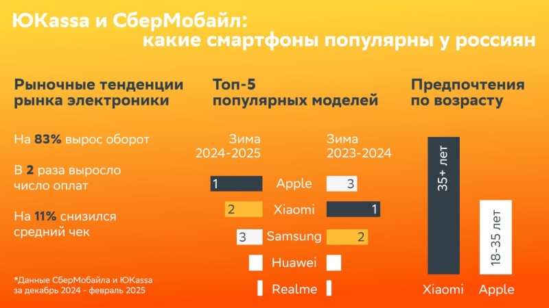 Примечательно, что предпочтения россиян зависят от их возраста: потребители в возрасте от 18 до 35 лет чаще выбирают продукцию Apple; покупатели старше 35 лет предпочитают продукцию Xiaomi. Спрос на электронику в России растёт, отмечают в «Юkassе», — этот сегмент остаётся на рынке одним из самых быстрорастущих. Минувшей зимой отмечен рост оборота в данной категории на 83 % в годовом исчислении; вдвое выросло число оплат.