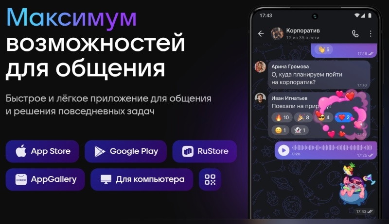 «В Max можно отправлять любые виды сообщений, видео, фотографий и файлы объёмом до 4 Гбайт совершенно бесплатно. Приложение поддерживает высокое качество голосовых и видеозвонков, которые работают даже на слабых устройствах и при низкой скорости интернета, — сказано на сайте платформы. — Max работает стабильно даже при слабом интернет-соединении, чтобы вы всегда оставались на связи».