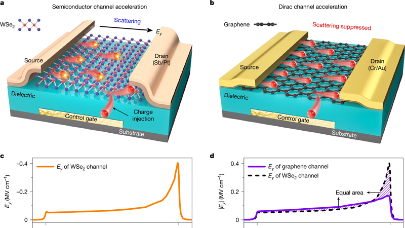 В общем случае графен считается так называемым дираковским материалом, в котором электроны подчиняются квантовым уравнения Дирака. Использование графена позволяет ускорить перемещение «горячих» электронов и дырок в ячейку памяти, минимизируя потери энергии. Фактически в созданных условиях электрон как бы становится безмассовой частицей, за счёт чего удаётся резко увеличить скорости записи и чтения. Работу о субнаносекундной флеш-памяти с 2D-улучшенной инжекцией горячих носителей (Subnanosecond flash memory enabled by 2D-enhanced hot-carrier injection) можно найти по этой ссылке. Она свободно доступна для прочтения.