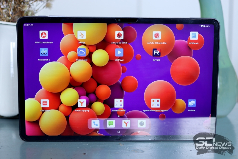 По производительности серьезных проблем нет – да, в играх не всегда будет высокая кадровая частота, о запасе на годы говорить не приходится, но система работает гладко, приложения открываются достаточно шустро, общие ощущения от использования планшета приятные, он совсем не «тормозной».