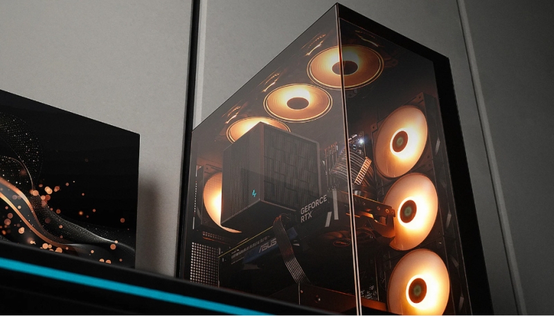 Если в DeepCool CG580 вы также будете использовать вентиляторы без подсветки, то корпус на столе будет выглядеть очень скромно и официально.