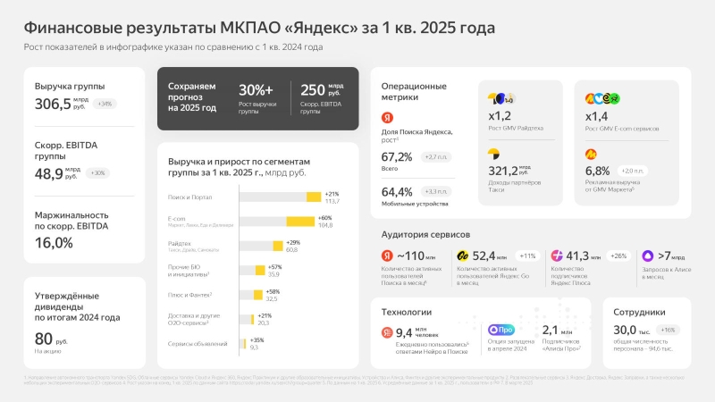 По итогам I квартала 2025 года компания «Яндекс» увеличила выручку на 34 % в годовом исчислении — она составила 306,5 млрд руб., скорректированный показатель EBITDA вырос с 37,6 млрд до 48,9 млрд руб., что соответствует росту на 30 %. На российском рынке веб-поиска «Яндекс» увеличил долю до 67,2 %.