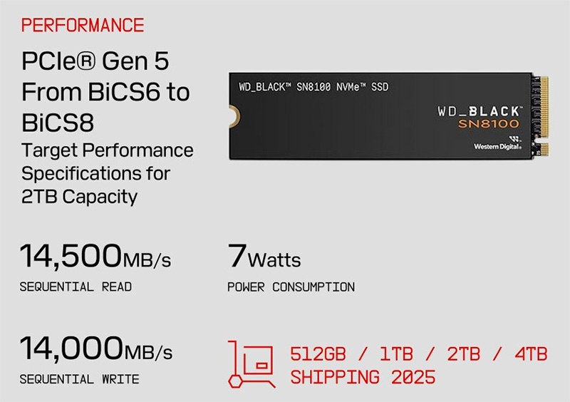 WD Black SN8100 станет первым PCIe 5.0 SSD в линейке и преемником SN850X — одного из лидеров среди PCIe 4.0 накопителей. Заявленные 14,9 Гбайт/с чтения и 14 Гбайт/с записи превосходят показатели PCIe 5.0-конкурентов от Samsung, Kingston и Crucial. В тестах случайных операций (2,3 млн IOPS) он уступает только Samsung 9100 Pro с фирменным контроллером Presto.