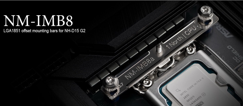 Компания Noctua выпустила крепление NM-IMB8 со смещением основания для своего флагманского кулера NH-D15 G2. Крепление позволяет сдвинуть основание кулера на 3,7 мм вверх и на 2 мм влево относительно центра процессорного разъёма, тем самым позволяя кулеру создавать больше давления на теплораспредилительную крышку непосредственно над горячими точками 20-ядерного Intel Core Ultra 7 265K и 24-ядерного Core Ultra 9 285K для платформы LGA 1851.