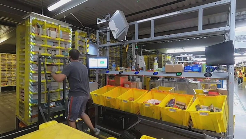 На складах Amazon товары хранятся в тканевых контейнерах в подвесных стеллажах. При поступлении товаров на склад работники оценивают их качество, прежде чем использовать обычное оборудование для укладки их в контейнеры для хранения. Когда клиент размещает заказ, сотрудники Amazon перемещают весь контейнер, в котором находится нужный товар, на станцию сбора, где его извлекают и направляют на упаковку, а затем — на отправку.