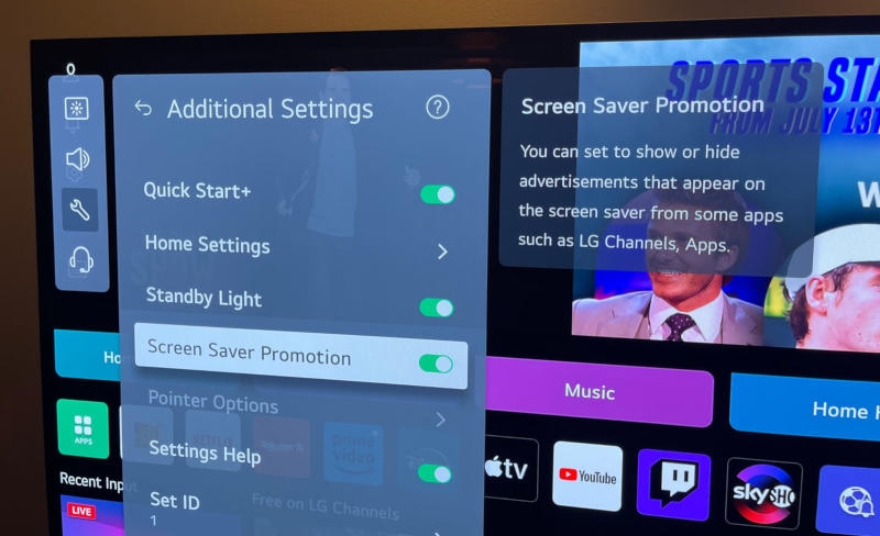 Реклама включена в настройках телевизора по умолчанию, и её можно отключить. Хотя другие производители пока используют заставки, чтобы показать что-нибудь более приятное, например, произведения искусства или сделанные владельцем фотографии. В профильном подразделении LG AD Solutions заявили, что реклама на заставке запускается «на главном экране, в LG Channels и в магазине контента на умных телевизорах LG». Идея в том, чтобы с пользой задействовать «время простоя экрана, превратив то, что может восприниматься как время простоя, в ценную возможность взаимодействия». Такая реклама, говорят в LG AD Solutions, «в среднем в 2,5 раза повышает узнаваемость бренда». «Раньше реклама на заставке могла значить, что зрители вышли из комнаты, но сегодняшние привычки при просмотре значительно отличаются. Теперь 93 % зрителей выполняют несколько задач сразу: переписываются, совершают покупки, смотрят социальные сети или играют на телефонах», — рассказал ресурсу Ars Technica технический директор LG AD Solutions Дэйв Рудник (Dave Rudnick).