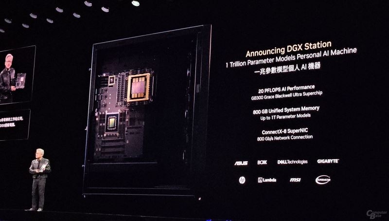 Рабочая станция DGX Station также демонстрирует впечатляющую производительность, несмотря на компактный корпус. Она построена на базе ускорителя Nvidia GB300 Grace Blackwell. Графический процессор Blackwell с тензорными ядрами последнего поколения подключён к Arm-процессору Grace с 72 ядрами Neoverse V2 через NVLink-C2C. Заявленная вычислительная мощность — до 20 петафлопс.