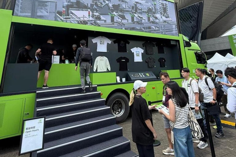 Возле Музыкального центра Тайбэя припарковался фирменный зелёный трейлер Nvidia с открытым бортом, к которому выстроилась длинная очередь. У многих технологических компаний сегодня есть фирменные магазины, где продаются футболки, толстовки, куртки и другие предметы гардероба с их логотипами. В случае с Nvidia узнаваемым символом стала не только эмблема компании, но и лицо её генерального директора. Вдоль очереди к трейлеру прохаживались сотрудники Nvidia и раздавали стоящим в ней карточки с краткими описаниями представленных товаров.