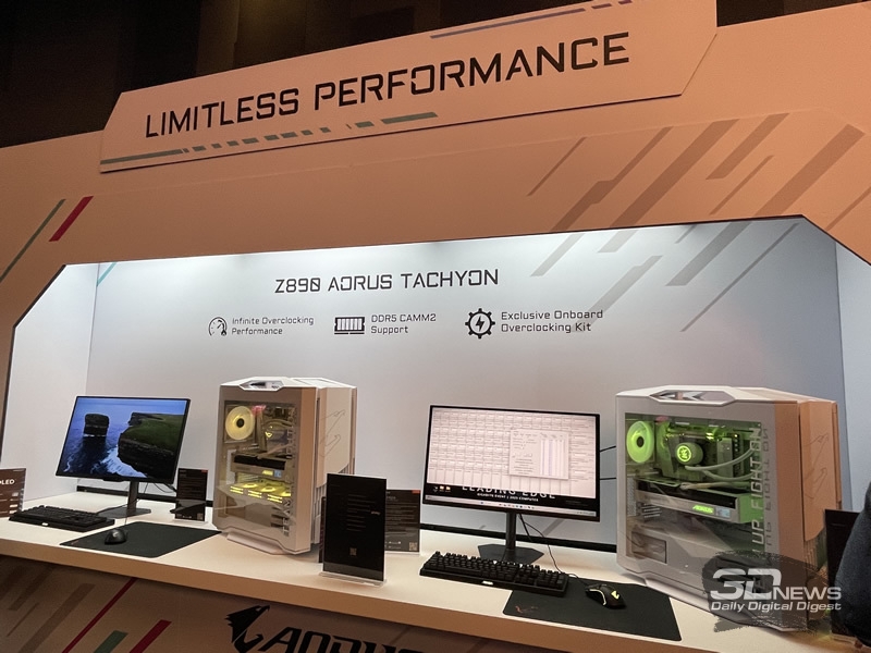 Gigabyte представила на выставке Computex 2025 материнскую плату AORUS Z890 Tachyon ICE с поддержкой CAMM2 DDR5 вместо привычных модулей памяти DIMM. Такой переход, ориентированный на оверклокеров и продвинутых пользователей, сулит улучшенное качество сигнала и возможность достижения более высоких частот по сравнению с традиционными DIMM.