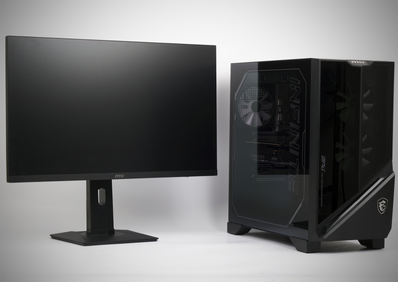 Системный блок оснащен RGB-подсветкой. Боковая стенка целиком выполнена из закаленного стекла. «Радужное» настроение обеспечивают корпусные вентиляторы и крыльчатки СЖО, водоблок, а также светодиодная лента, закрепленная на передней панели корпуса. Все RGB-элементы подключены к материнской плате — последняя оснащена тремя 3-пиновыми коннекторами ARGB и одним 4-пиновым разъемом RGB. Подсветка легко настраивается в специальном ПО от MSI.
