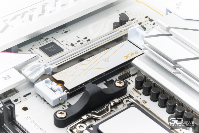 Тестовые накопители при испытаниях устанавливаются на материнской плате во второй слот PCIe 5.0 x16 (через переходник Asus PCIe 5.0 M.2 Card), к которому подведены линии PCI Express непосредственно от процессора.