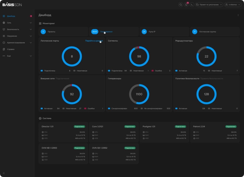Basis SDN обеспечивает единую точку входа для управления, конфигурирования и мониторинга виртуальной сетевой инфраструктуры организации. Благодаря этому администратор получает полное представление о состоянии сетей и может оперативно реагировать на любые изменения.