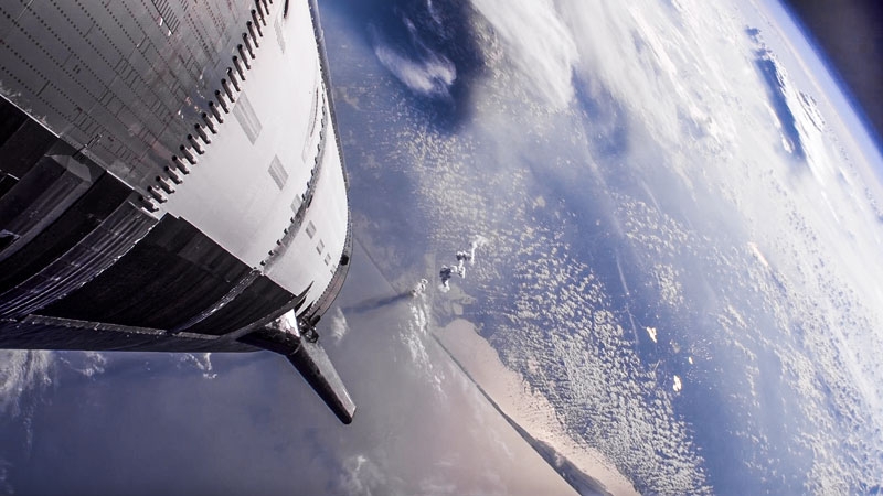 Ещё один снимок был сделан сразу после разделения двух элементов ракеты — ускорителя Super Heavy и верхней ступени Starship. На этом снимке, сделанном из моторного отсека Starship, видно, как Super Heavy удаляется, а в верхней части ракеты полыхает оранжевое пламя, на фоне которого виднеется голубая Земля.