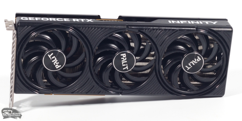 Благодаря тому, что печатная плата ускорителя намного меньше полных габаритов Palit GeForce RTX 5060 Infinity 3, половина радиатора продувается насквозь через решетку в защитной пластине на обратной стороне PCB.