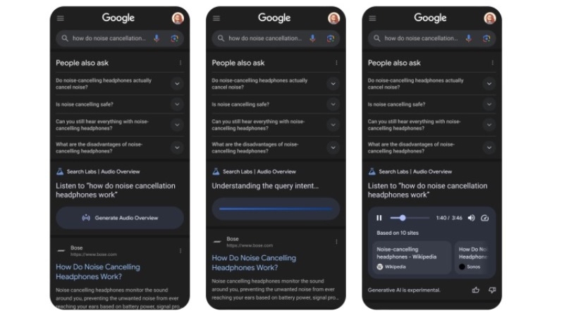 При выполнении запроса, например: «Как работают наушники с шумоподавлением?», в разделе People also ask (аналог «Пользователи также интересуются») может появиться кнопка Generate Audio Overview. Нажатие запускает процесс генерации аудиофайла, в котором ИИ в формате разговора двух ведущих озвучивает краткий подкаст-обзор по теме. Генерация занимает в среднем 30–40 секунд. Аудиофайл встраивается прямо в выдачу поиска с помощью мини-плеера, позволяющего запускать и приостанавливать воспроизведение, настраивать скорость, отключать звук. Под плеером отображаются ссылки на источники, использованные при генерации: страницы с релевантным контентом, статьи и другие открытые материалы.