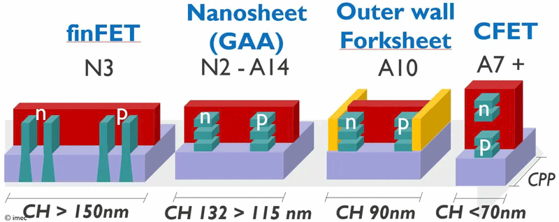 Около шести лет назад бельгийский центр Imec представил совершенно новую архитектуру транзисторов — CFET (комплементарные FET). Она должна была помочь с производством транзисторов с нормами производства менее 2 нм. Особенностью архитектуры стали раздельные наностраничные каналы (forksheet). Но технология оказалась сложна для производства, поэтому в Imec создали видоизменённый промежуточный вариант будущей архитектуры, представленный на днях.