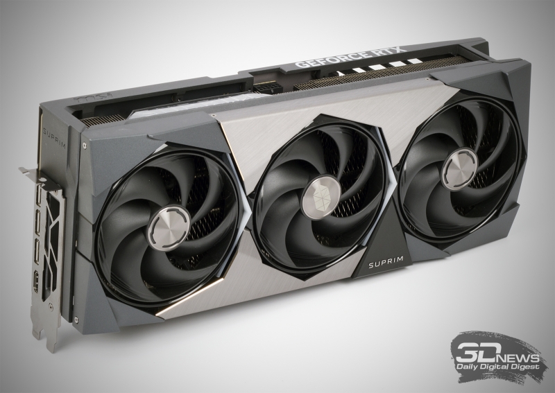 Подпорка точно пригодится, ведь SUPRIM-версия GeForce RTX 5080 поражает своими размерами и массой. Длина устройства составляет 36 см, а его масса — внушительные 2,6 кг. Естественно, производителю, снабдившему свой продукт столь крупным кулером, пришлось пойти на ряд ухищрений. Об этом я обязательно расскажу далее. А пока отмечаем, что высота GeForce RTX 5080 16G SUPRIM SOC составляет 15 см, толщина — 7,5 см. Устройство занимает четыре слота расширения в корпусе.