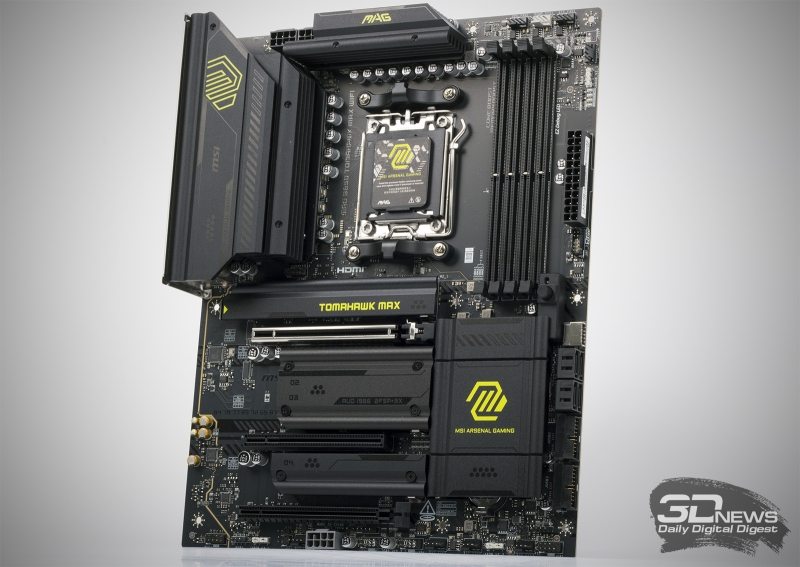 Массовая платформа AMD AM5 разрастается — подробно про это мы рассказывали в майском выпуске «Компьютера месяца». К лету 2025 года рынок материнских плат, поддерживающих чипы поколений Ryzen 7000, Ryzen 8000G и Ryzen 9000, включая модели с увеличенным объемом кеш-памяти, оказался по-настоящему велик. Теперь пользователь, желающий собрать игровой ПК, выбирает среди устройств, использующих чипсеты 600-й и 800-й серий — разгуляться определенно есть где. Платы на базе набора логики B850 пришли на смену B650- и B650E-материнкам. Доступные в продаже модели получили поддержку PCI Express 5.0 для слота PEG и портов M.2, однако реализация полной функциональности устройств целиком и полностью лежит на производителе. MSI MAG B850 TOMAHAWK MAX WIFI — пример материнской платы, которая не использует флагманский чипсет, но предлагает потенциальному покупателю отличные надежность, быстродействие и функциональность.