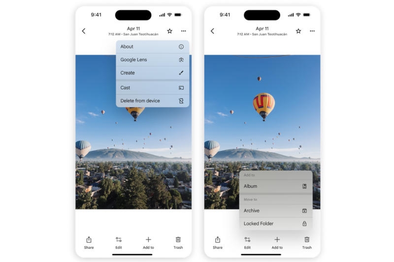 По нажатии значка с тремя точками в правом верхнем углу теперь выводится меню операций с фотографией, в котором появился пункт «Google Объектив» — раньше он располагался на панели задач при просмотре изображения, а вместо него теперь находится меню «Добавить»: в архив, в альбомы или защищённую папку. Собственное меню, вызываемое кнопкой с тремя точками, появилось у подборок и серий фотографий, — оно показывается у любой выбранной в данный момент миниатюры. Здесь можно изменить верхний снимок, удалить фотографию или выбрать инструмент для массовой обработки фото.