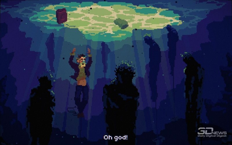 Во-первых, The Drifter на удивление удобна — хотя при взгляде на скриншоты это утверждение может показаться странным. Да, здесь действительно очень крупные пиксели, отчего порой на экране мы наблюдаем визуальную кашу. Для жанра, где нам физически надо подмечать глазами элементы и предметы, с которыми можно взаимодействовать, это должно быть смертельно. Но нет, проблем с распознаванием нужных вещей (как было в тех самых «лукасартовских» квестах) не возникает. Логика применения предметов проста и очевидна — загвоздки случаются, но, как правило, они связаны не с нелогичностью предлагаемых операций, а с недостаточным уровнем интеллекта игрока (меня). Вдобавок мы всегда ограничены небольшим набором предметов и локаций, так что в крайнем случае всегда поможет элементарный перебор.