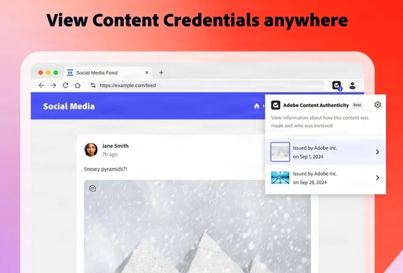 Adobe упростила проверку наличия Content Credentials на веб-сайтах, которые не предоставляют эту информацию своим пользователям. Веб-приложение Content Authenticity включает инструмент, который восстанавливает и отображает эти метаданные и историю редактирования, а расширение Content Authenticity для Google Chrome, бета-версия которого уже доступна, сможет проверять контент непосредственно на веб-странице.