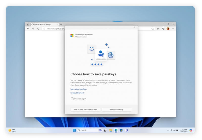 Microsoft вскоре улучшит поддержку ключей доступа (passkeys) в Windows 11 — эта технология предлагает удобную беспарольную авторизацию. Обновлённый интерфейс Windows Hello предложит выбор, куда сохранять ключи, например, синхронизировать с учётной записью Microsoft, хранить в 1Password, Bitwarden или у других поставщиков услуг авторизации.