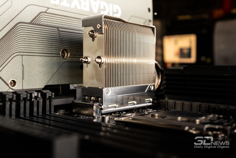 Конкретнее, кулер Spatium M580 Frozr возвышается над поверхностью накопителя на 67 мм, но зато в горизонтальной проекции он выходит за габариты M.2 2280-платы лишь в сторону противоположную разъёму и всего лишь на 15 мм. Благодаря этому проблем с размещением накопителя с такой системой охлаждения в ближнем к процессору слоте M.2 на полноразмерной материнской плате, скорее всего, не возникнет. Единственное, что может сулить неприятности, — габаритные кулеры CPU, заходящие в пространство над первым слотом M.2, чем, например, отличаются двухсекционные башни, рассчитанные на 140-мм вентиляторы.