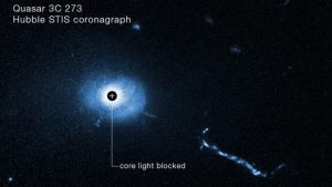 «Хаббл» впервые разглядел окрестности квазара и засёк там «капли» и огромную струю